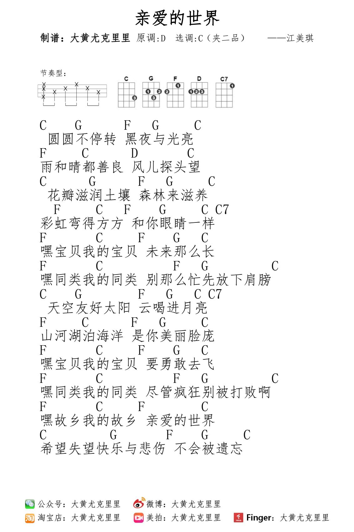 亲爱的世界 ——江美琪【每天一张尤克里里谱:第一千零二十八首】 大黄尤克里里 港台女星 2018-01-10 16:53:54 825 创作不易,用心坚持,欢迎请BaGua喝几杯爱心咖啡!打赏并支持本文 打赏并删除本文 每天一谱戳进去可以查看自学课程哦:第一课:调音第二课:音阶第三课:四大和弦第四课:分解节奏型第五课:右手食指扫弦第六课:切音 《情非得已》第七课:民谣摇滚节奏型 《小手拉大手》第八课:切音的运用 《青春修炼手册》第九课:卡农和弦 《遥远的她》《天使》《倔强》《知足》第十课:复合节奏型 《思念是一种病》尤克里里弹唱 & 教学视频:《闷骚的你》——好妹妹乐队《生活不止眼前的苟且》——许巍《历历万乡》——陈粒《祝你生日快乐》《追梦赤子心》——GALA《残酷月光》——林宥嘉《后来的我们》——五月天《可惜没如果》——林俊杰《七里香》——周杰伦《分手快乐》——梁静茹《旅行的意义》——陈绮贞《当你老了》——赵照《宠物小精灵》——国语版《蓝瘦 香菇》《女孩子》——大黄尤克里里完整和弦表淘宝店铺搜索:大黄尤克里里 创作不易,用心坚持,欢迎请BaGua喝几杯爱心咖啡!打赏并支持本文 打赏并删除本文 感谢您的支持鼓励,我会继续努力的!文章地址:用户邮箱:打赏金额:USDT 请输入数字点击”去打赏“,即可进行打赏支持本文章哦 江美琪 About the Author 大黄尤克里里 功能介绍:六扇门里太龌龊,不如四根弦上取磊落. Related Posts 换——金玟岐【每天一张尤克里里谱:第一千四百零九首】 2019-03-14 22:52:19 小白——周柏豪【每天一张尤克里里谱:第一千三百七十八首】 2019-02-11 23:15:45 跳舞吧——陈绮贞【每天一张尤克里里谱:第一千三百六十八首】 2019-02-01 20:38:48 短发——梁咏琪【每天一张尤克里里谱:第一千三百六十一首】 2019-01-25 23:11:31 别说没爱过——韦礼安【每天一张尤克里里谱:第一千三百零六首】 2018-12-01 18:47:39 发表评论