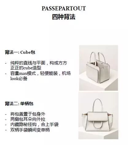 Valextra这个牌子凰尚之前也介绍过:1937年,设计大师Giovanni Fontana于米兰创立奢华皮具品牌Valextra,摩纳哥王妃Grace Kelly、贝嫂都是Valextra的大粉丝;建筑设计是Valextra的品牌DNA,经典系列都是以知名建筑为灵感设计的。2017秋冬最新推出的Passepartout 魔方包,像魔方一般灵活多变,设计可变幻多种造型,有五种创意背法,堪称包包界的“变形金刚”。魔方包的初始打开方式像一只四四方方的立方体,有着建筑般的直线棱角和轮廓;每只魔方包都自带一只同色系、可拆卸的手包,通过隐藏式暗扣装饰于包身正面,共有中号 & 大号两款尺寸。