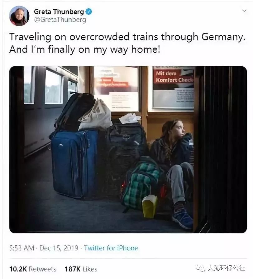 事情的起因,源于桑伯格于当地时间12月15日在她个人社交账号上发布的一则贴文。当时,上周五先后在西班牙马德里和意大利都灵参加了气候变化活动的桑伯格,正乘坐火车经德国返回老家瑞典。