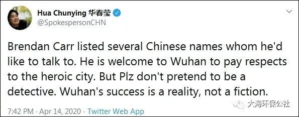 “布伦丹·卡尔列出了几个他想与之‘对话’的中国人的名字。欢迎他来武汉向这座英雄城市致敬。但请不要假装是侦探。武汉的成功是真实的,不是虚构的。”