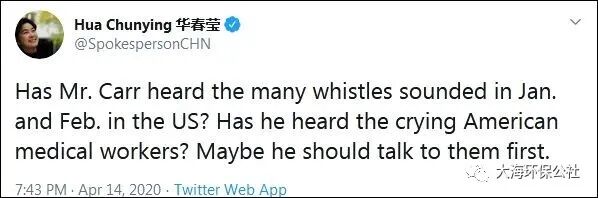 4月14日,华春莹在推特账号连发4条推文,对卡尔作出有力回应: