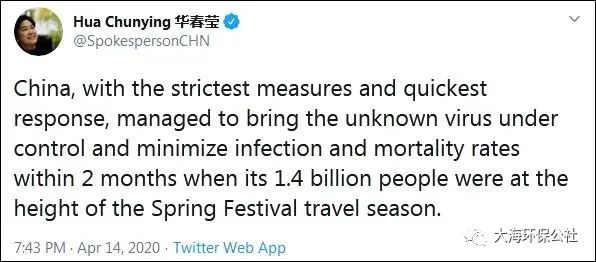“中国以最严格的措施和最迅速的反应,在14亿人口正处于春运高峰的两个月内,成功地控制了这一未知病毒,并将感染率和死亡率降至最低。”