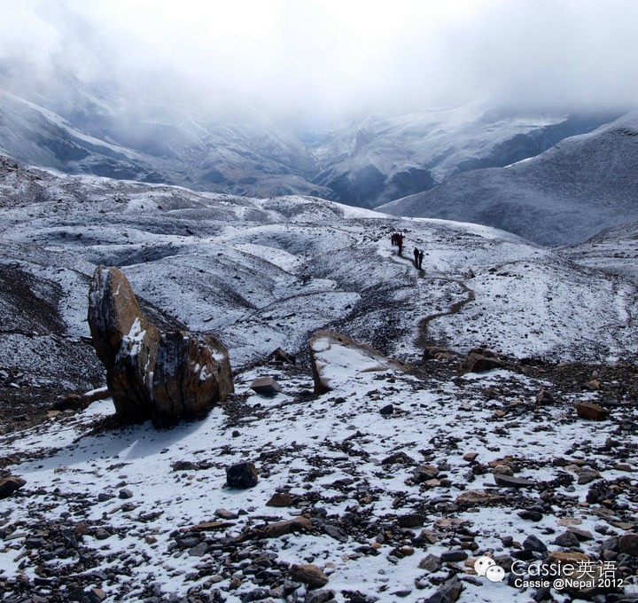最后一天是最艰难的。为了躲过垭口的大风,我们凌晨4点就出发了,那时海拔已在5000以上,浓雾迷离,只有凌晨的一点点微光。打着电筒一步一步的挪移,狭窄的路边是看不见底的一片白茫茫。极冷,呼吸困难,在这样的状况下边走边照相是很困难的。不过我真庆幸当时不辞辛苦,记录下来这个历程。