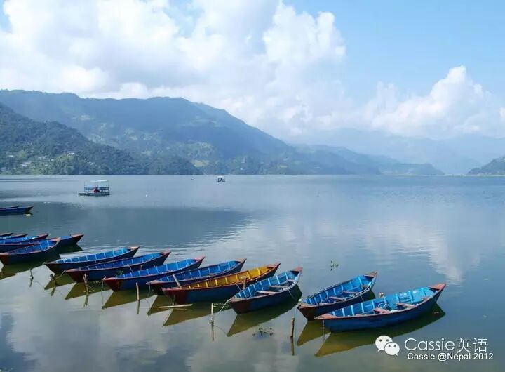 博卡拉的湖边总是泊着漆了色的船,同白云一起倒映在水中,分外的清静。一天我们租了艘船,划到湖中央,我按耐不住扑腾一下跳下河游泳,自由自在多么快乐!
