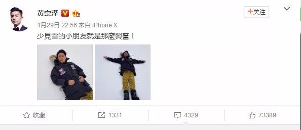 看大图的黄宗泽,身穿海军蓝色奢侈品羽绒服,下身搭配了一条黄色图案裤子,整个人躺在雪地上,对着镜头摆了造型。也难怪,常年生活在香港的他,应该是很少有时间接触到这么厚的大雪景色吧。