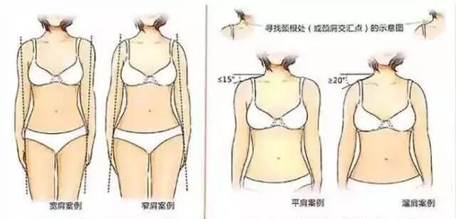 我们的肩部的形状可分为平肩、宽肩、窄肩、溜肩这四种,一般来说根据肩膀的水平角度线来判断我们的肩型。▼
