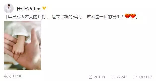 任嘉伦升级当爹,还没有公开结婚消息的他,居然就当爸了,让不少粉丝很意外。不过他说“早已成为家人的我们”,看来间接承认已婚啦!恭喜如此低调的二位