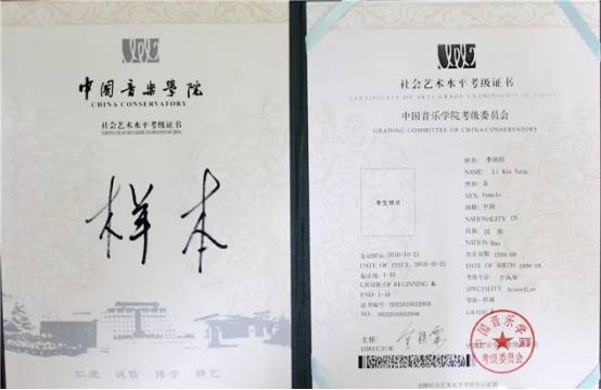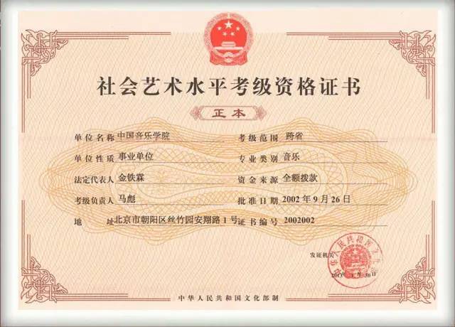 中国音乐学院艺术考级证书是经文化部备案的考级证书,均带有文化部特制的条形码,每本证书都有金铁霖教授签名。