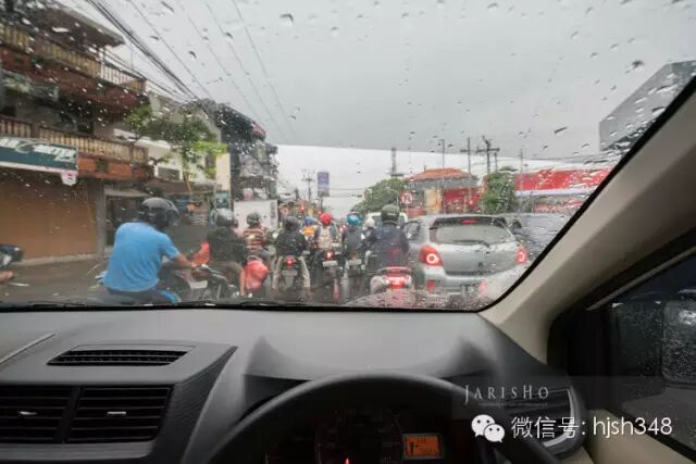 开车去金巴兰海滩看日落,顺便在那里买点海鲜。天还在绵绵细雨。遇上下班时间,路上很堵。加上巴厘岛的路多是两车道双向。