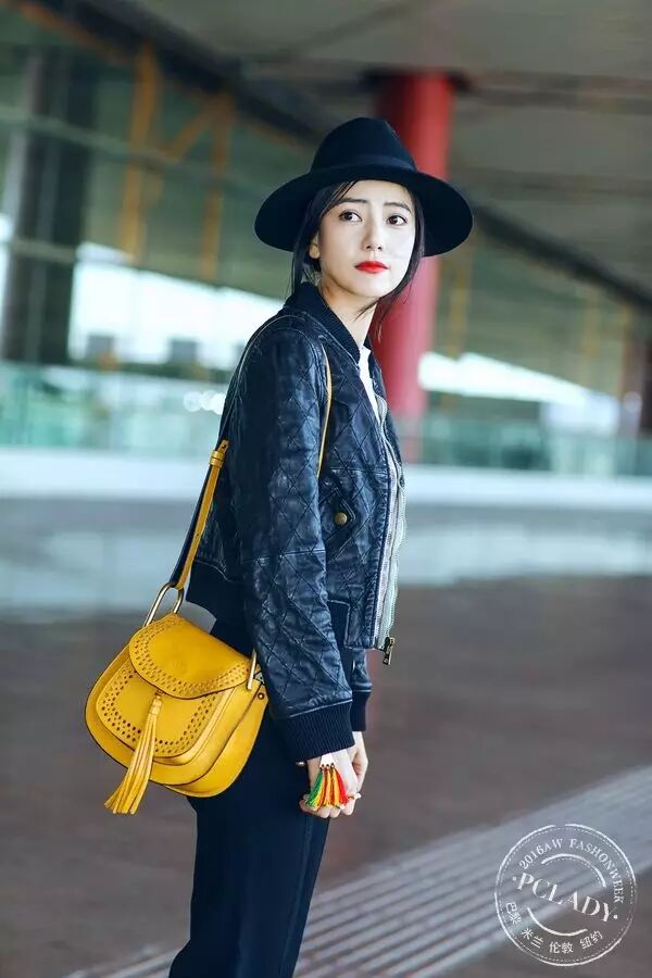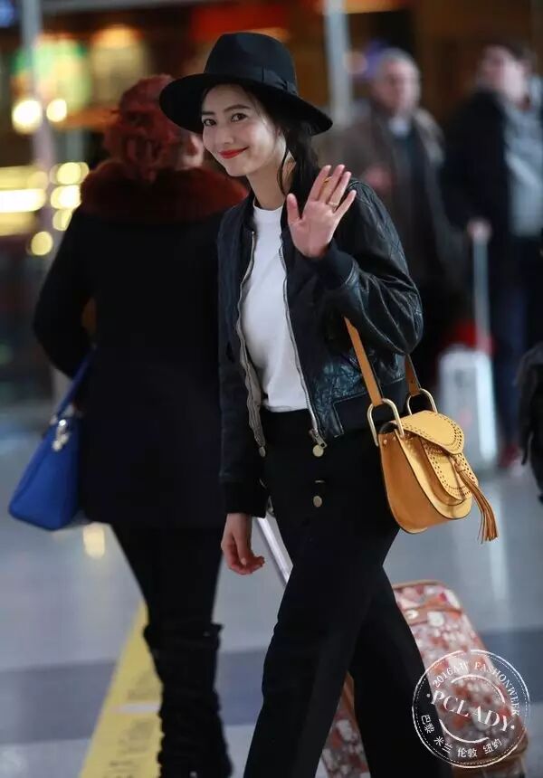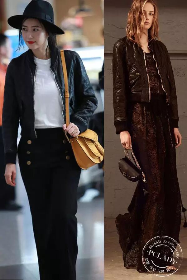 高圆圆身穿Chloe 2016 早春黑色皮夹克出发巴黎