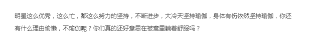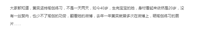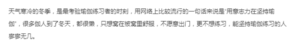 相对于现实生活中,很多人因为天气冷一点,路程远一点,环境差一点等等原因,就放弃瑜伽的人来说,在这样寒冷的冬天,黄奕继续坚持瑜伽,更是带伤坚持练习,这种坚强和努力,抛去明星的光环,也非常让人佩服!值得大家学习!