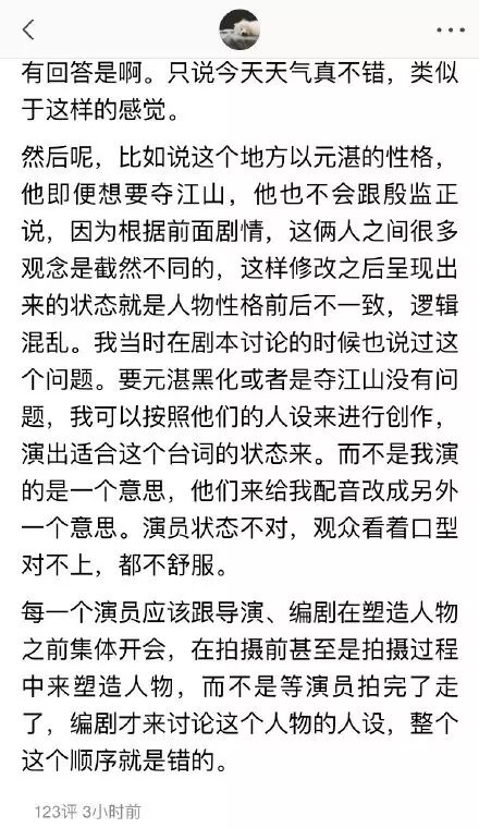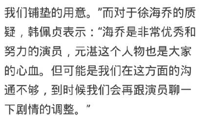 而对于徐海乔的质疑,他表示:“海乔是非常优秀和努力的演员,元湛这个人物也是大家的心血,但可能是我们再这方面的沟通不够,到时候我们会再跟演员聊一下剧情的调整。”