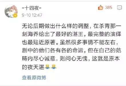 此外,该剧原著作者十四夜对徐海乔饰演的元湛进行了高度肯定,力赞其还原度高演绎出了最好的元湛。