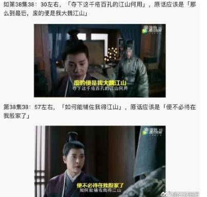 根据网友贴出视频截图对比,显示元湛的台词确实有改动。第38集38:30左右,「夺下这千疮百孔的江山何用」,原话应该是「那么到最后,废的便是我大魏江山」 第38集38:57左右,「如何能辅佐我得江山」,原话应该是「便不必待在我殷家了」 这才是真正的湛王!!