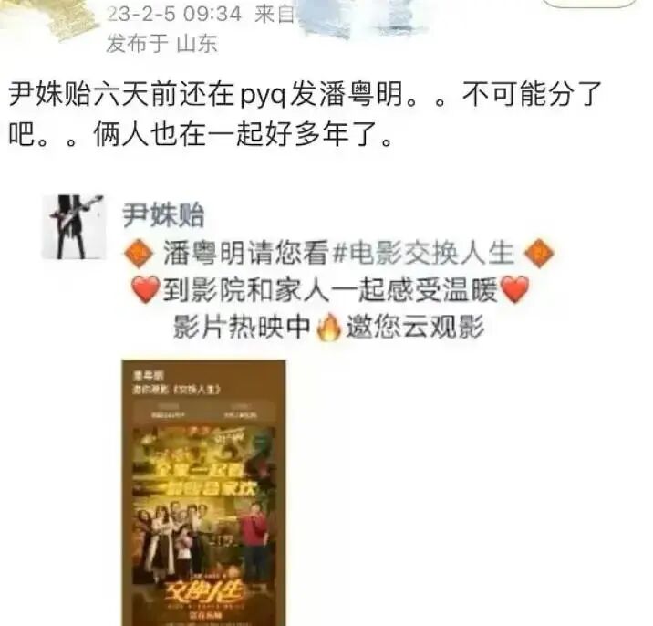 一周前,尹姝贻还在朋友圈发布关于潘粤明的信息,两人的感情应该是很稳定,不存在和董洁复合的消息。