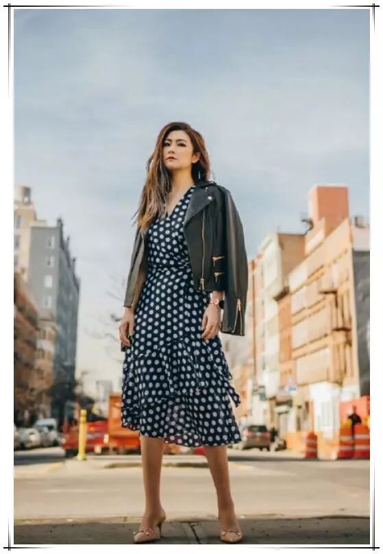 任家萱穿了一件波点的印花长裙搭配皮衣,这样的穿搭机可以让他很好的凸显出女性甜美可爱的感觉,同时穿上皮衣的任家萱也是非常的有气质有气场,她把这两种风格很好的融合在了一起。