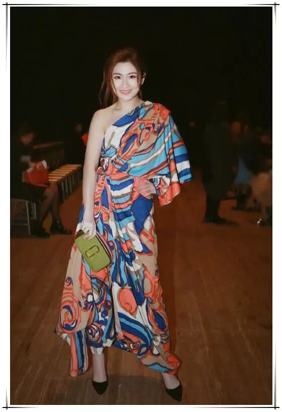 任家萱带穿了一件戴着夸张花纹的连衣裙,这件连衣裙上半部分肩膀的部分是不规则的设计,所以让她看起来格外的个性,同时这样夸张的印花让也只有任家萱可以很好的驾驭住。