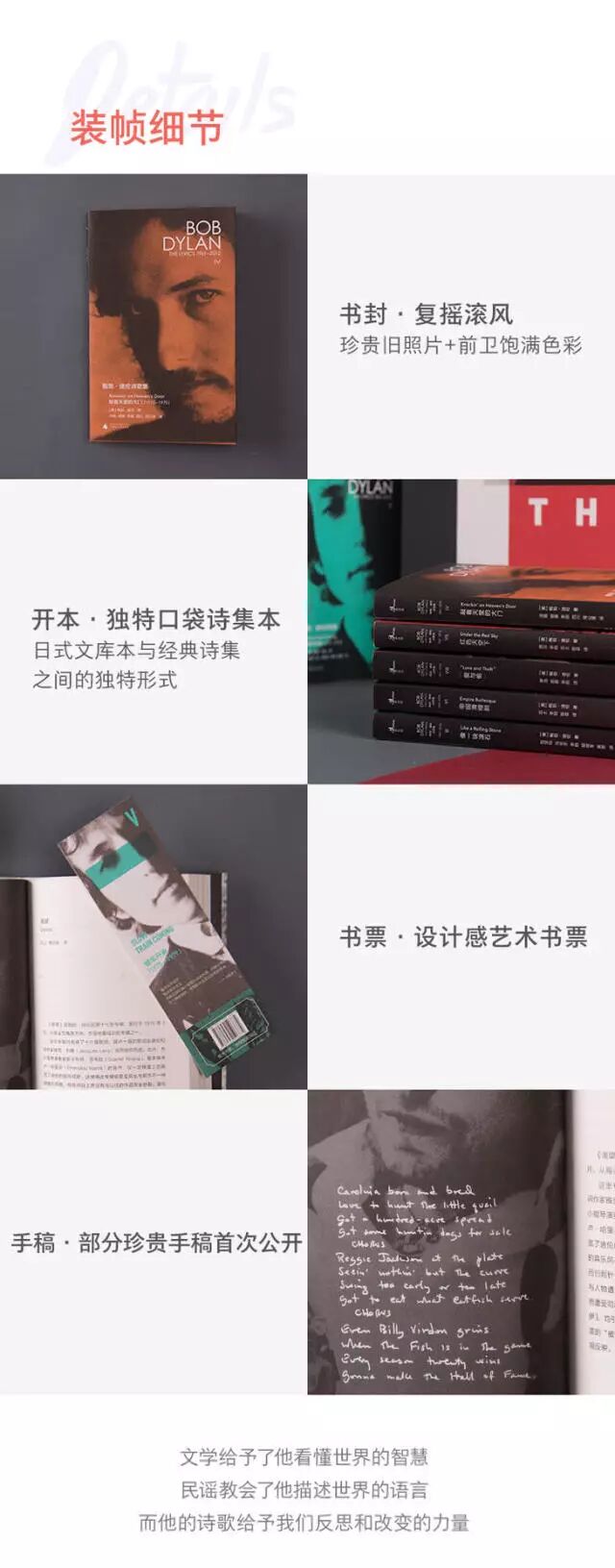 这套《鲍勃·迪伦诗歌集》一共收录了鲍勃·迪伦的31张经典专辑、共369首作品、手稿。