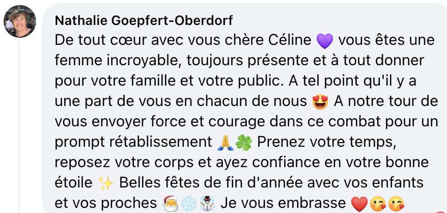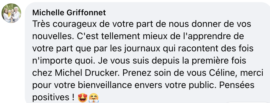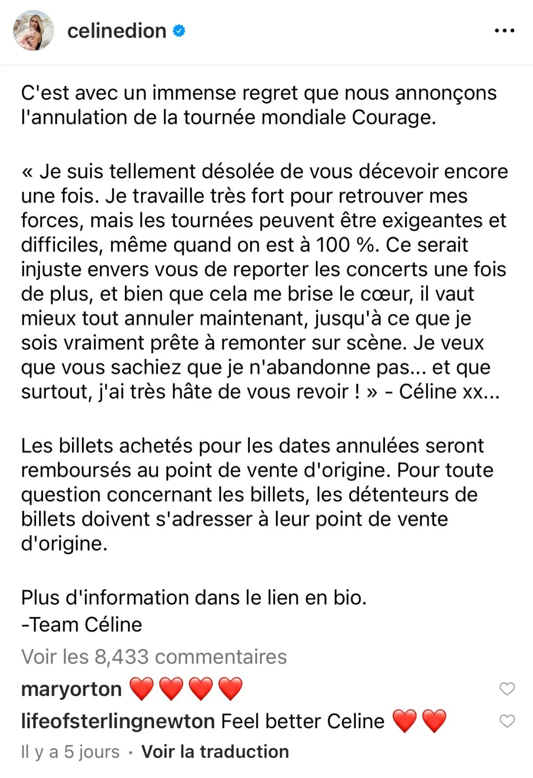 “很抱歉再一次让你们失望了。我正在努力复健,但即使是我状态最好的时候,举办巡演依旧是一项要求极高且困难重重的工作。我知道再次取消演出对你们来说是很不公平的。但即使心痛,我还是不得不决定取消,直到我真正做好重回舞台的准备。我想让你们知道我是不会轻言放弃的……更重要的是,我已经迫不及待想要再见到你们了!”——席琳·迪翁