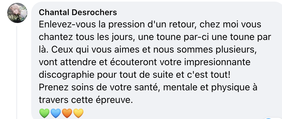 “我必须承认,这是一场斗争。歌唱,是我一生都在做的事,这也是我最喜欢做的事,我真的很想你们,想念站在舞台上看见你们的时光。我如此爱你们,祝你们一切安好。”