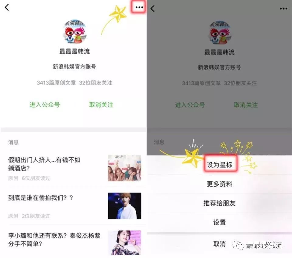 大家点击【最最最韩流】的蓝字或者头像就可以进入我们的单独页面,然后按照下图所示将最韩流设为星标。