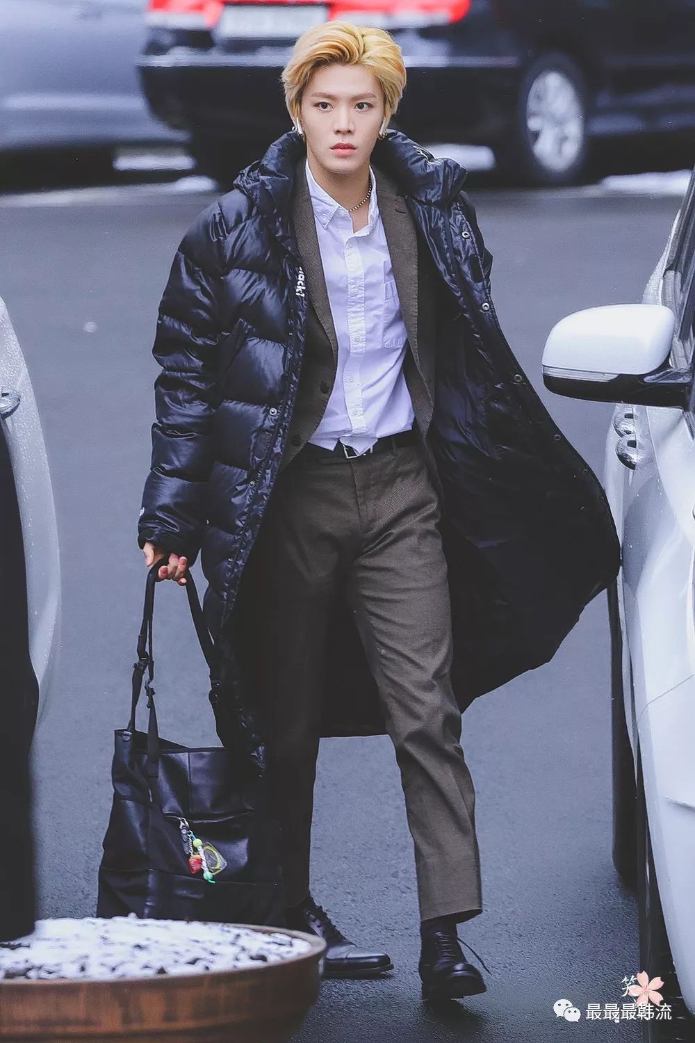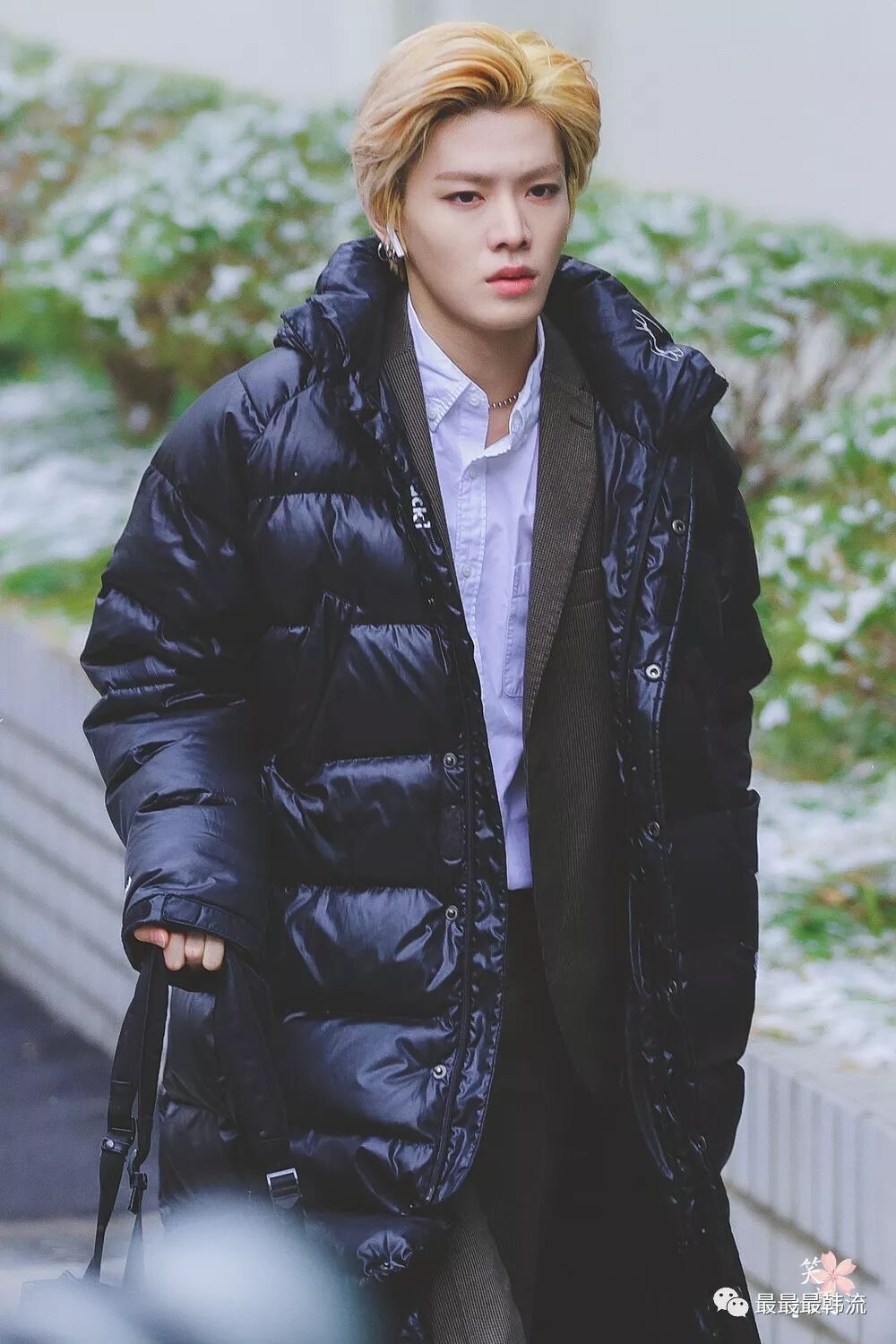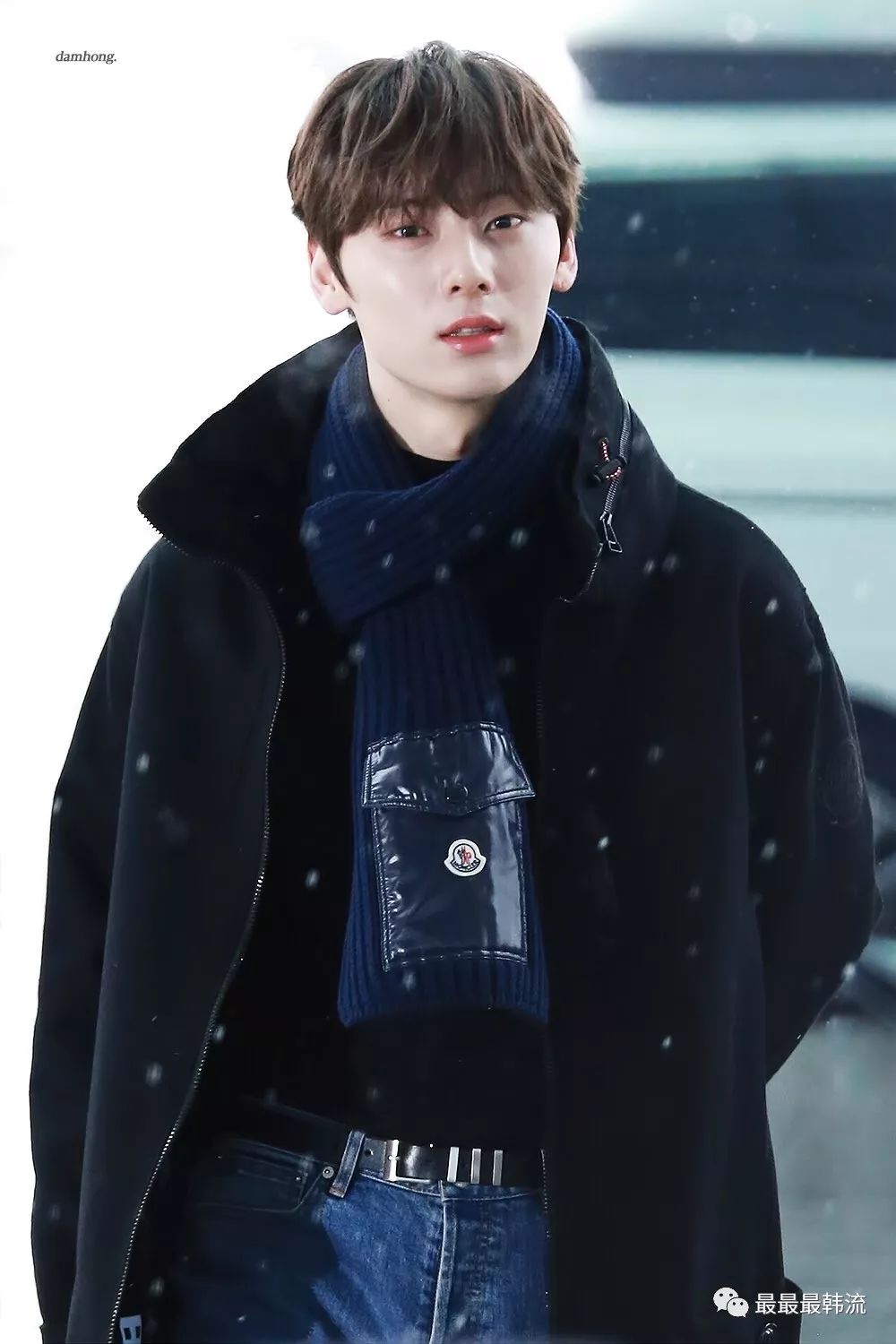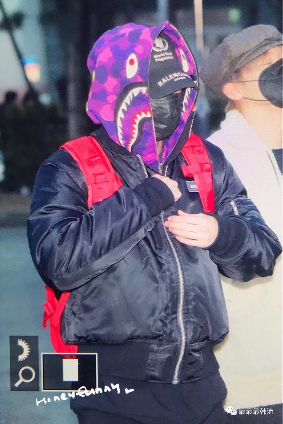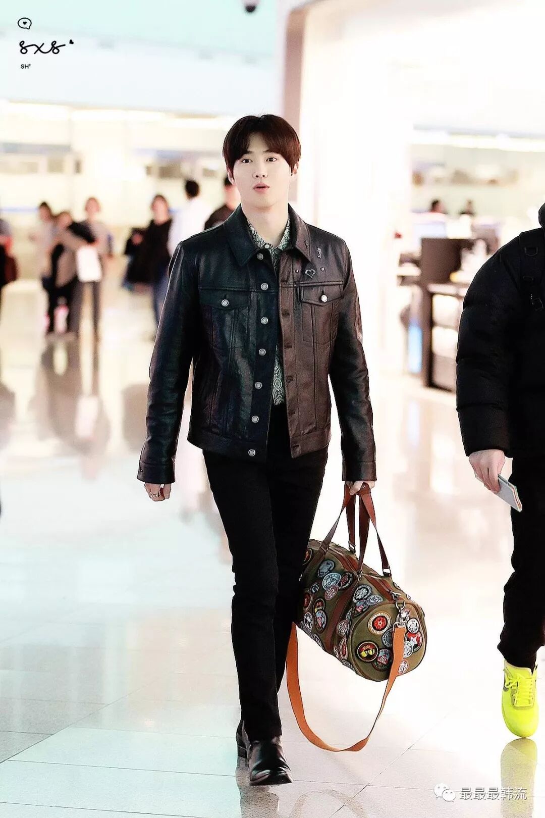 在奂的机场也是all black套装,这款外套我相信大家也依旧见到过不少相似的了。