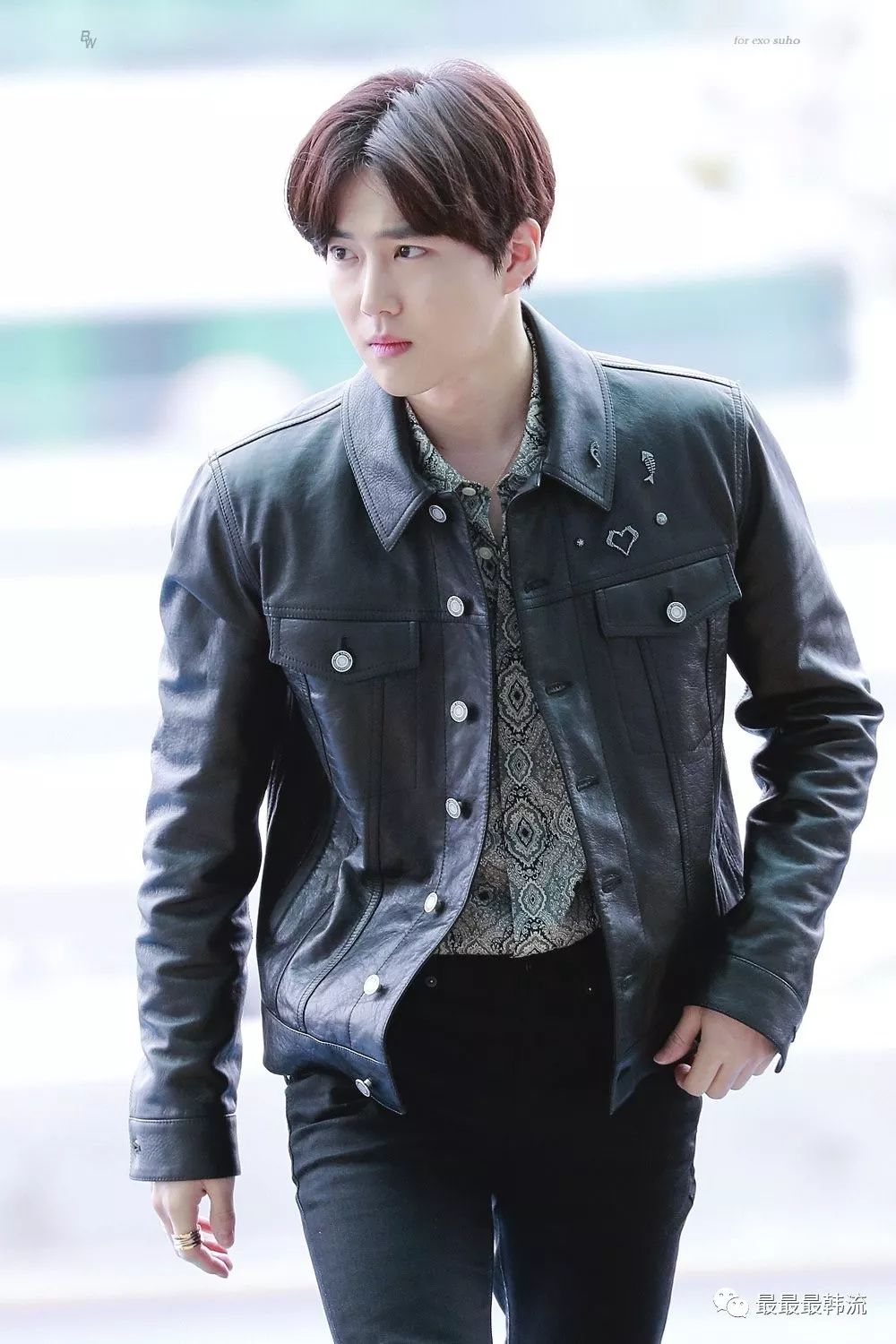 这次的机场装选择了皮衣夹克,基本以黑色为主的套装非常硬气,但是里面搭配的花衬衫以及夹克领口的爱心设计都柔和了整体感觉。