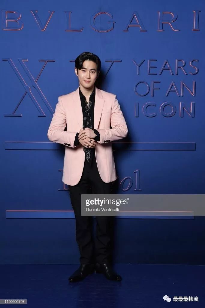 复古的粉色西装搭配纯黑衬衫,色彩组合突出重点。而配饰选择的布花结更是点缀整体,果然是贵公子。