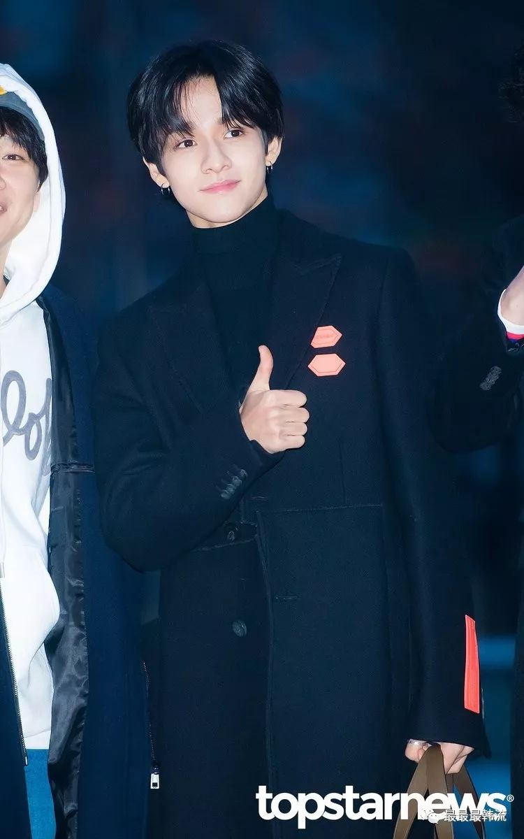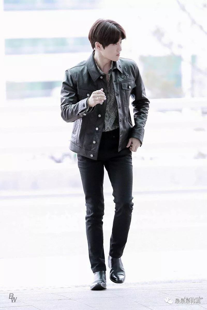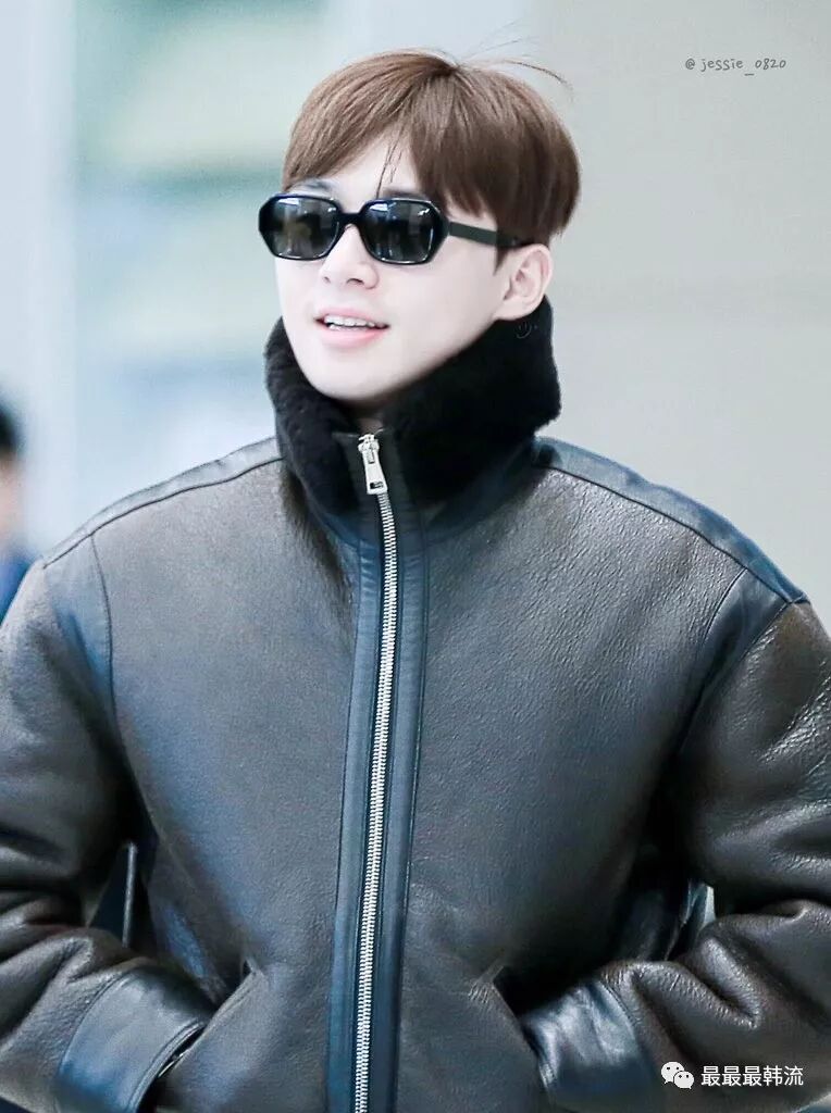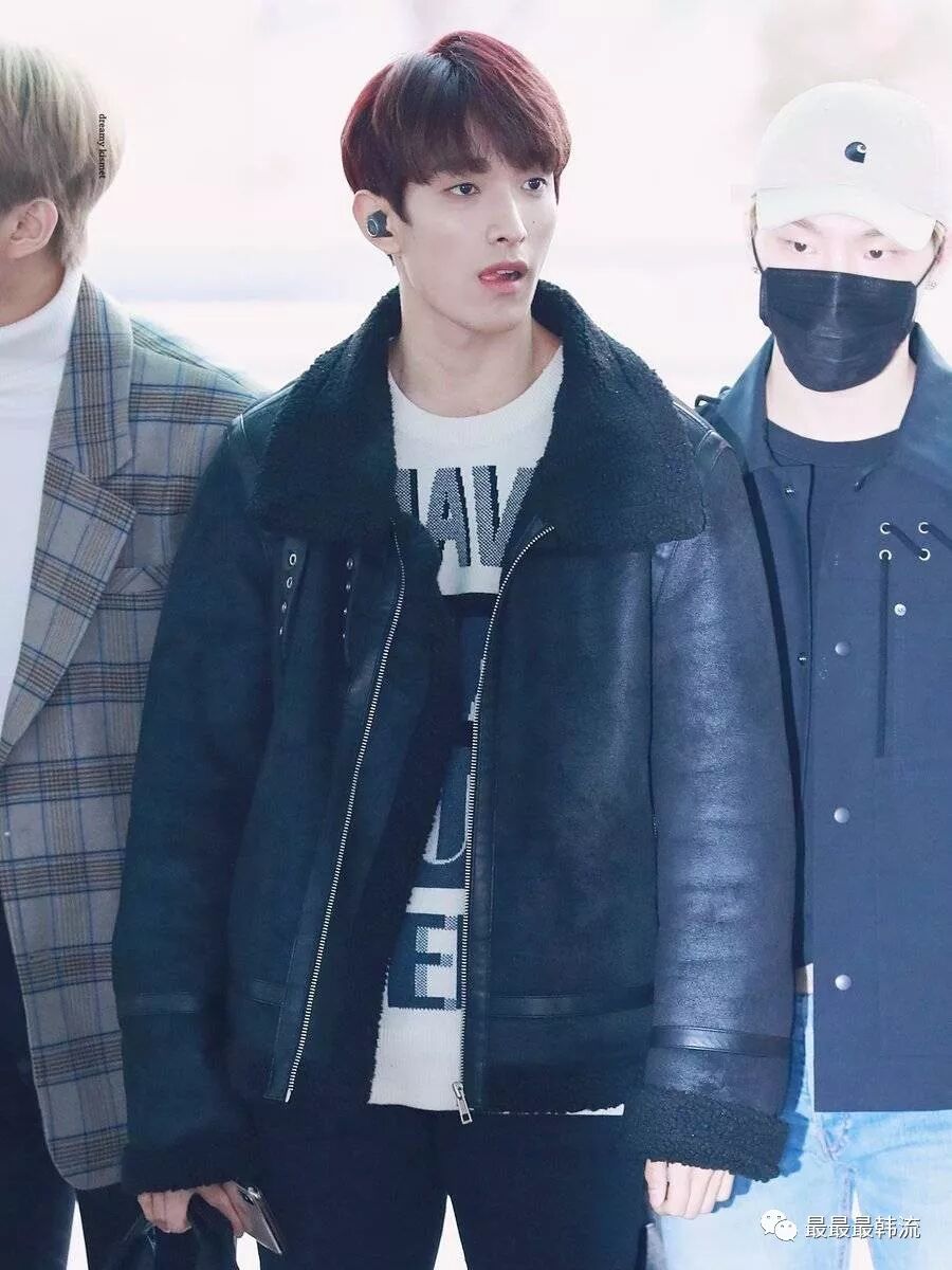 而身上这件黑色皮衣最近在男爱豆中也是很流行,新晋的冬日必备品。毛领设计不仅能保暖,还能起到修饰脸型的作用。