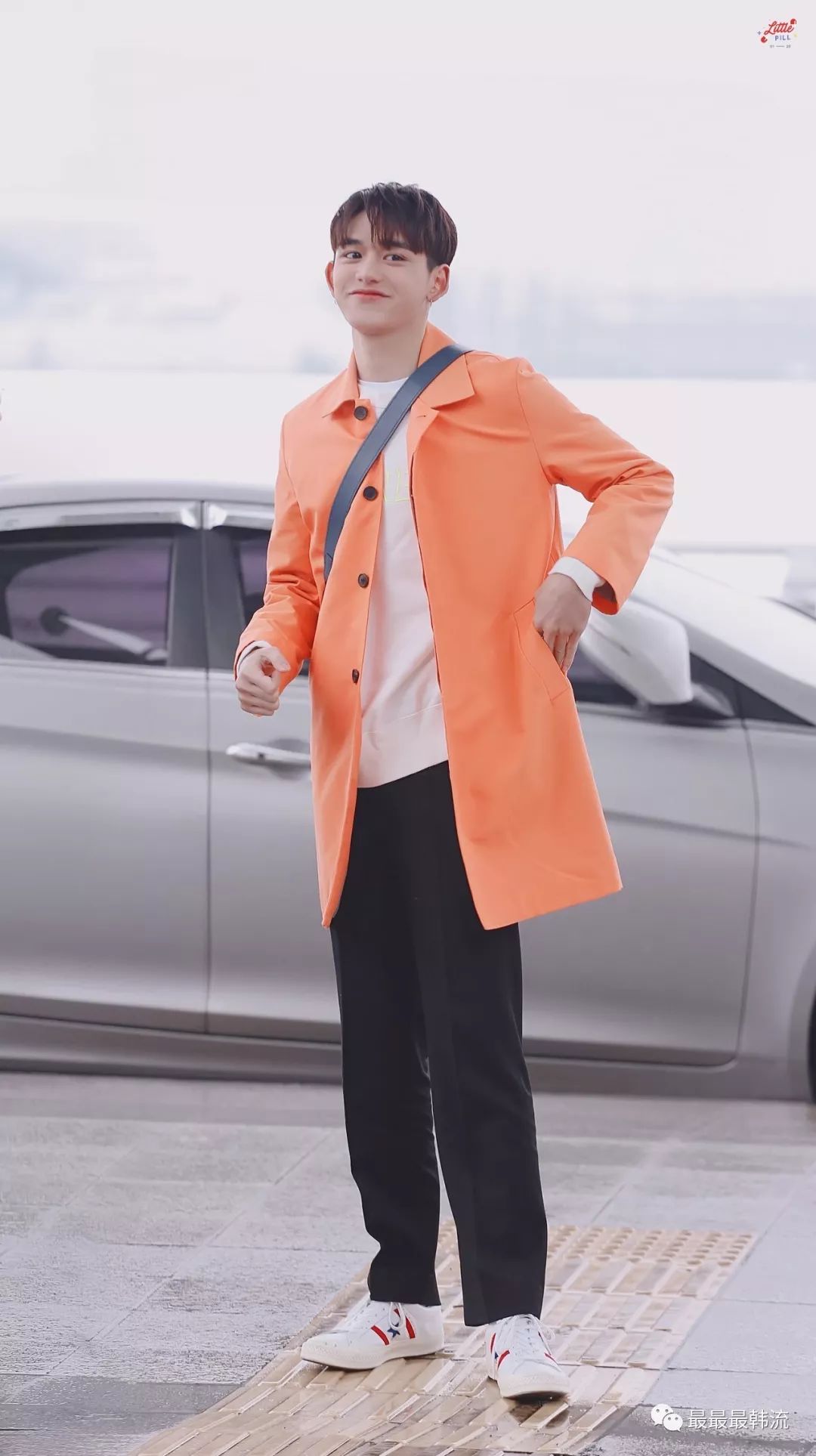这次机场装也和本人一样,非常的开朗活泼。橘色的长款风衣仿佛暖阳一般,看着就很有治愈效果。