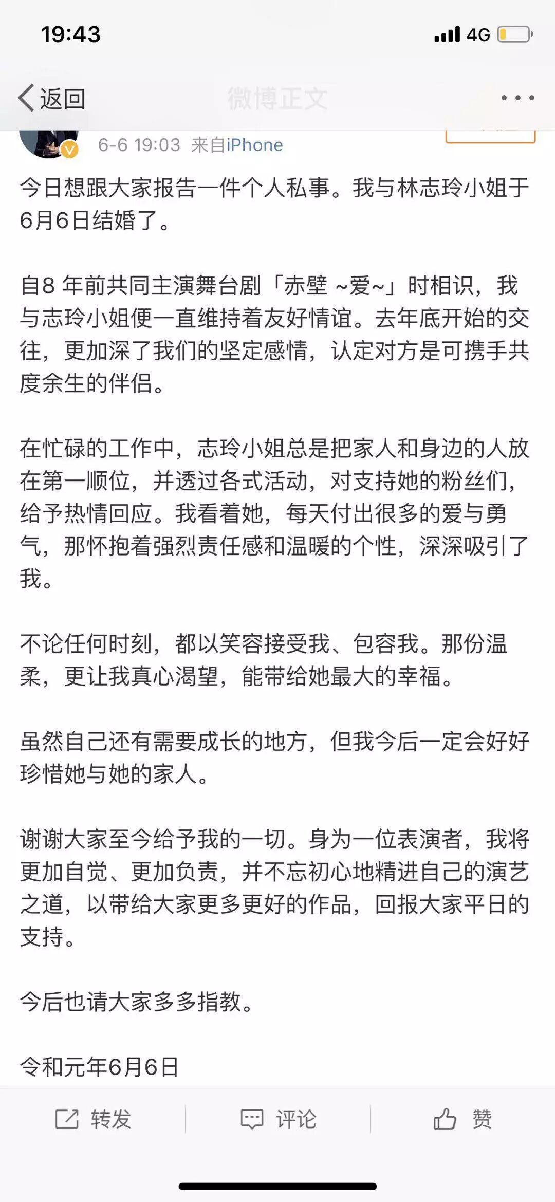 丈夫是日本艺人,两人8年前共同主演舞台剧《赤壁 爱》时相识、去年底开始的交往、6月6日结婚!