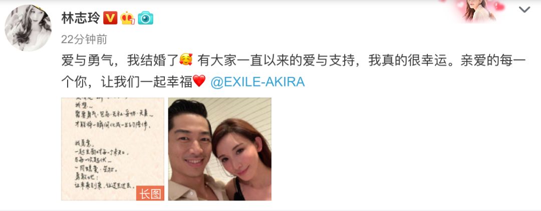 不久前林志玲在微博发布了自己结婚的消息,并附上了和丈夫的甜蜜合照。