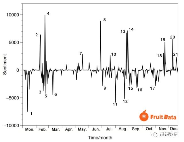 1. 情绪年谱图中共有11个较明显的正峰和10个较明显的负峰,说明在受关注较多的事件上,积极情绪略占上风。