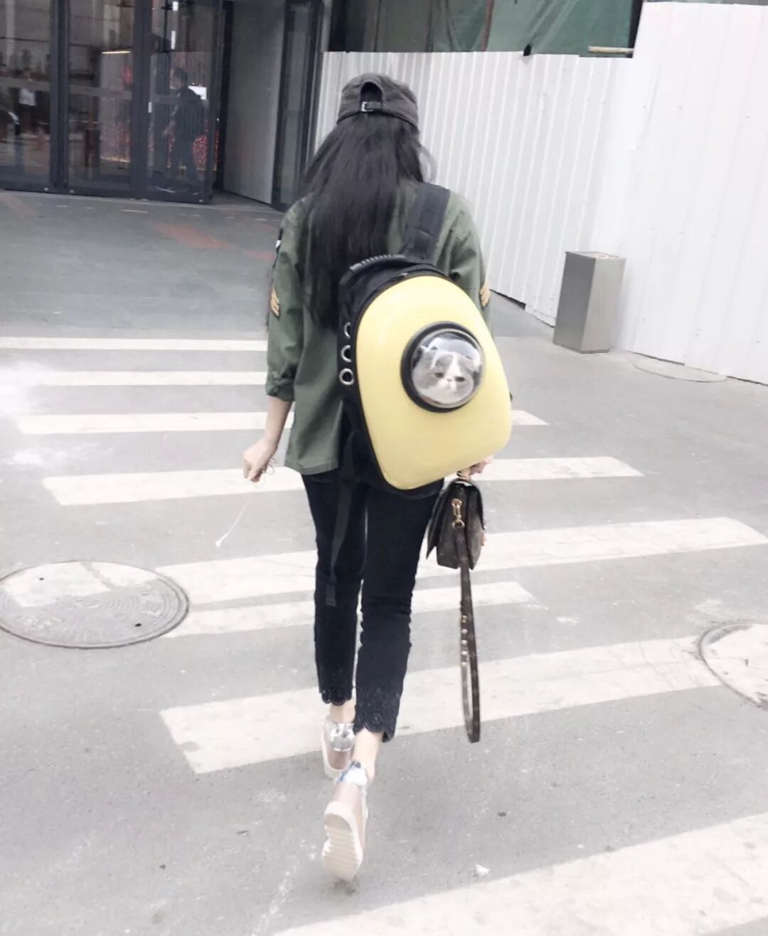 工作的时候,害怕猫主子没人照顾,就背着一起走。