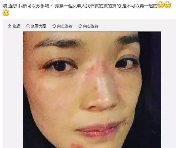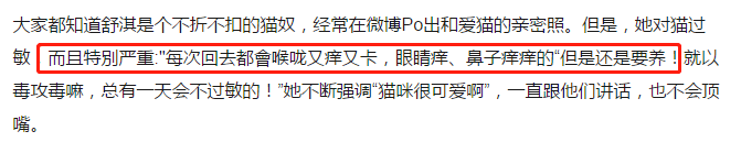 她自己本身对猫毛过敏,而且每次都会很严重,喉咙、眼睛、鼻子都会特别痒。之前她还发过自己过敏的照片,脸上有很多红肿。