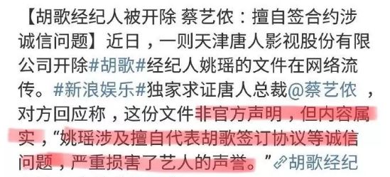 因为经纪人严重违反公司的规章制度,导致公司跟胡歌在名誉和经济上蒙受了严重损失。