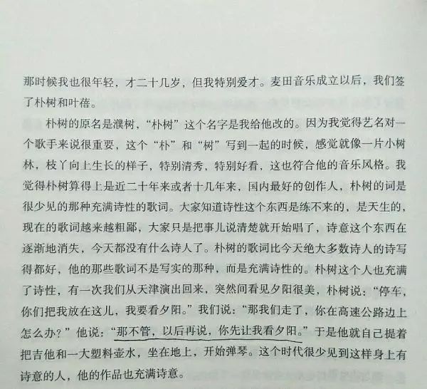 当主持人鲁豫问道是否是因为对自己的才华还不够自信时,朴树点头表示是这样:比如刚写完一首歌时会觉得自己简直就是天才,而吃完饭再听就又会觉得完全是大狗屎。
