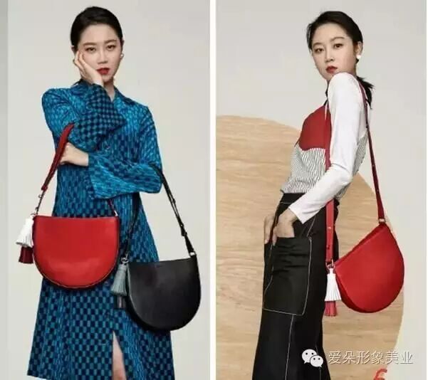 蓝色的包包和红色的鞋子与衣服的颜色相呼应,特别和谐统一。