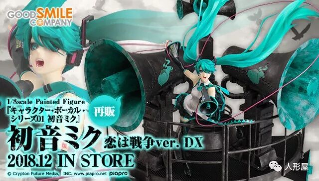 出自ryo(乐曲)×三轮士郎(插画)于2008年2月22日投稿的supercell代表作「恋爱战争」,「初音未来」的比例模型为纪念投稿10周年决定再次贩售!向上飞舞的长发与裙摆、单手拿著扩音器、身体向前嘶吼、激烈且美丽的动态感等等,忠实呈现出三轮士郎原画中的样貌。内附重现了插图背景中的巨大喇叭、充满魄力的超大型台座。尽情欣赏「恋爱战争」的世界观吧!