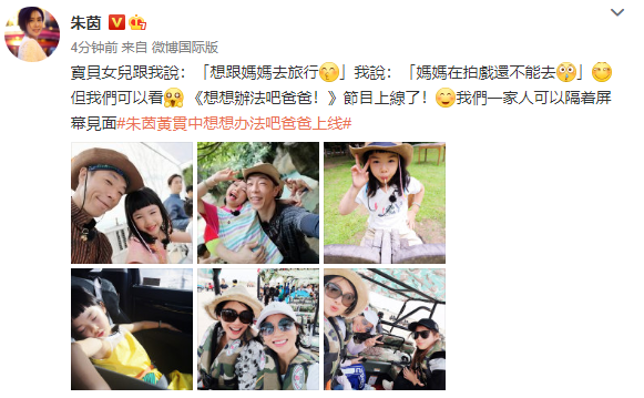 9月30日,朱茵在社交平台晒出一组老公和女儿的照片,其实朱茵挺少主动晒黄贯中和女儿,这次也是因为女儿参加的综艺节目《想想办法吧爸爸》开播。