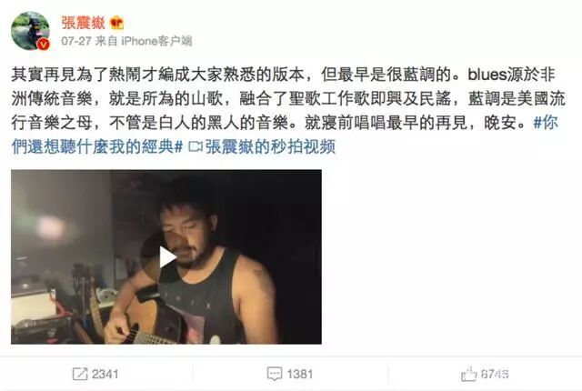 前段时间,他开始在微博里唱自己的歌:《路口》、《再见》、《小宇》……一件背心、一把吉他、一副嗓音,没有任何修饰、单纯地唱着歌,却醉倒了很多人。