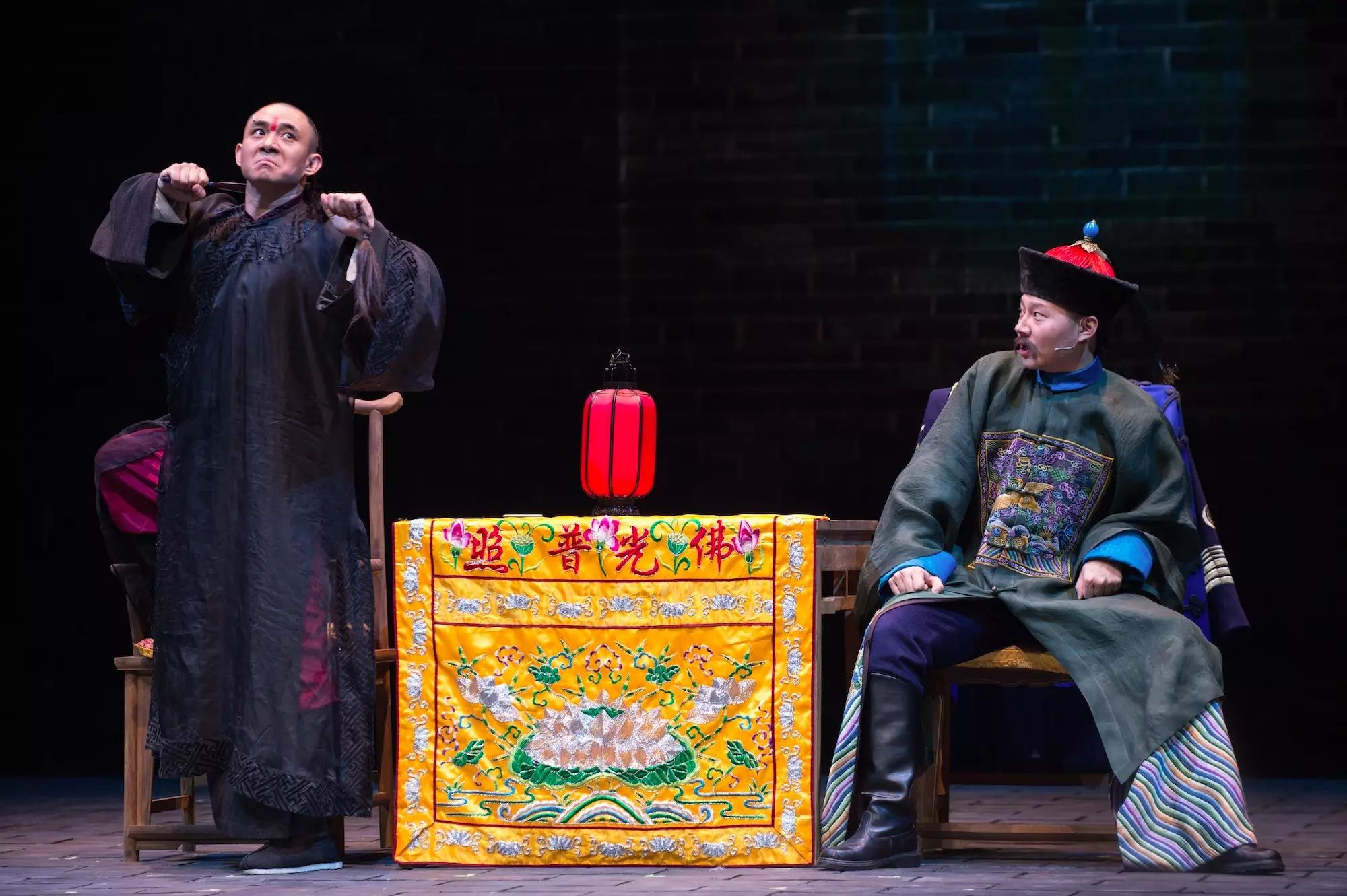 贾一平老师十几年没有出演过舞台剧,但一上舞台,声音浑厚亲和压得住场,“夜访法华寺”一段,一袭黑袍被他帅气的一拎上桌,身体有很好的控制,好似一位经验丰富的舞台剧演员。