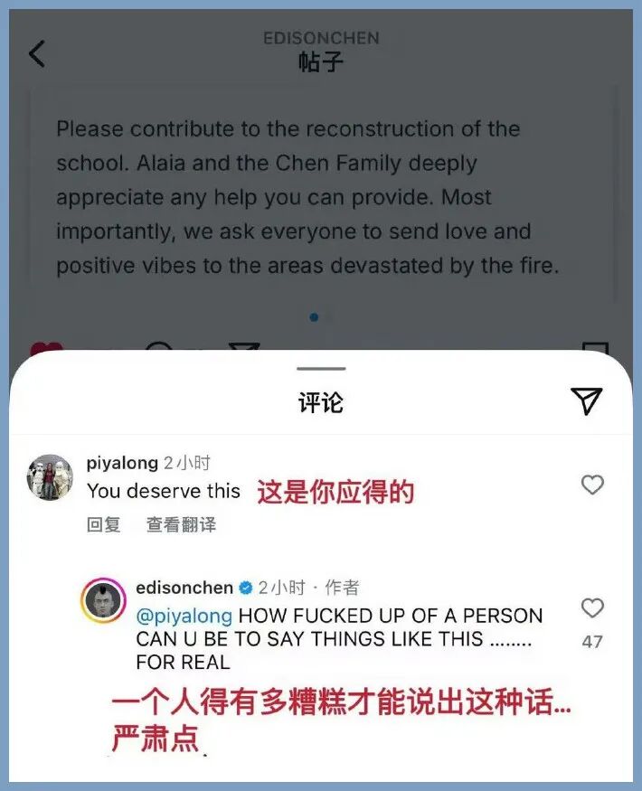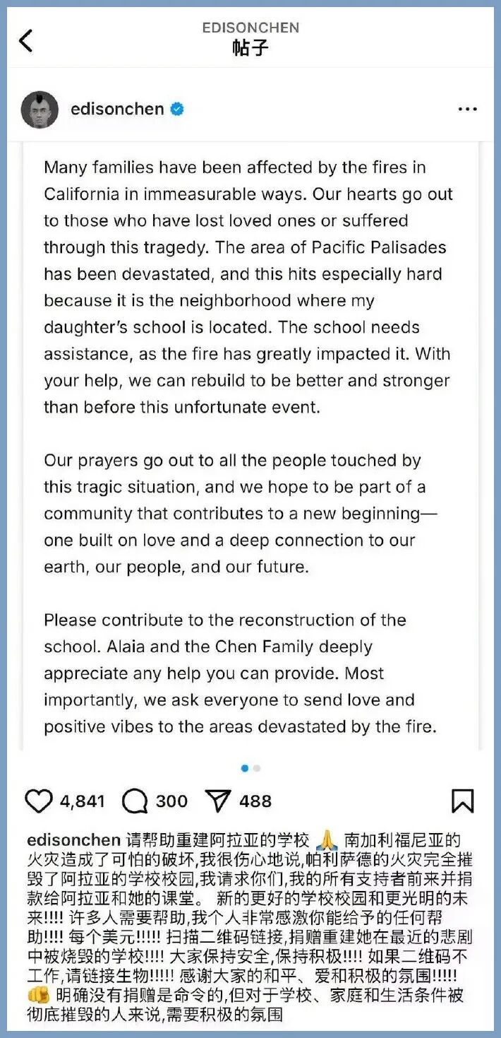 在此期间,陈冠希女儿在美国南加州的学校也被山火烧毁了。