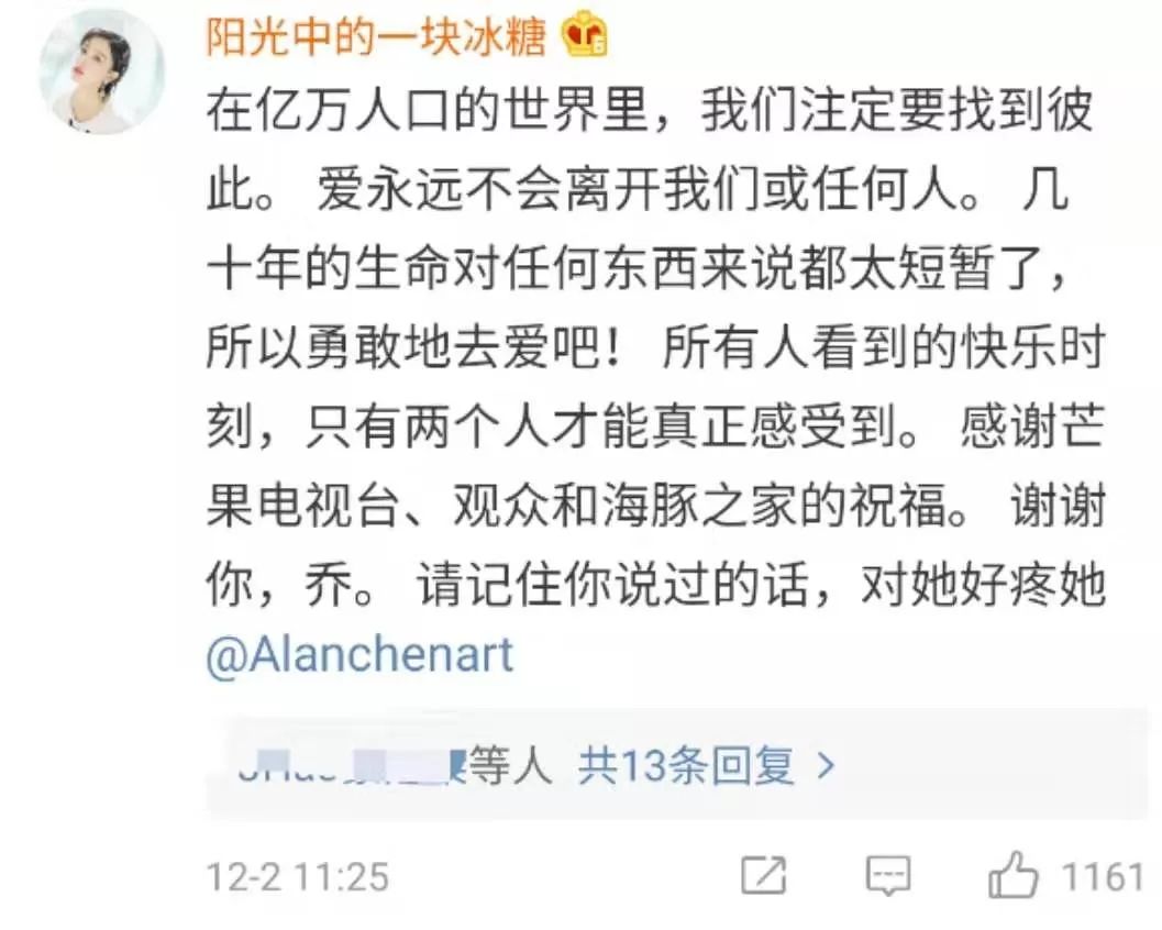 哎……希望一切正如陈乔恩所说是误会一场吧,也希望她是真的足够了解男方了才决定投入爱情。祝幸福喽。