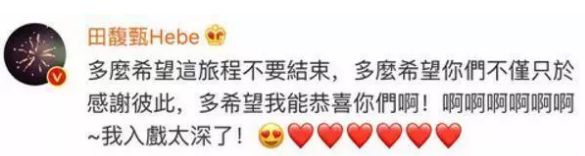 然后?Selina的看似官宣营业气息满满的微博下,好姐妹Hebe表示“多希望你们不只感谢对方,我入戏太深”。