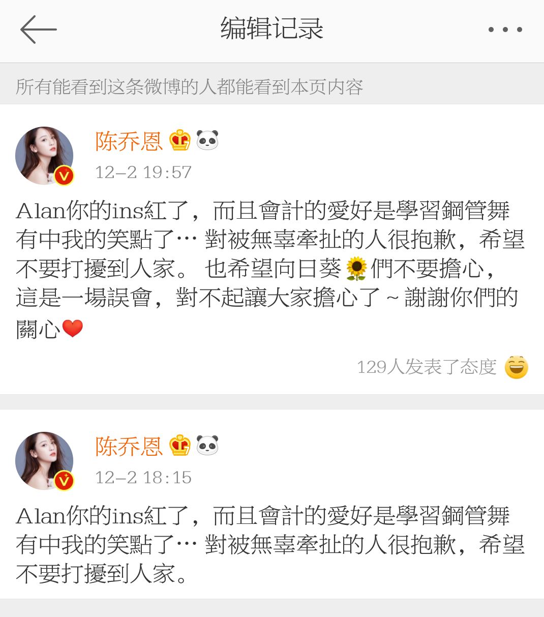 事情越闹越大后,陈乔恩编辑了微博,特意补充说对不起让大家担心了,谢谢你们的关心。
