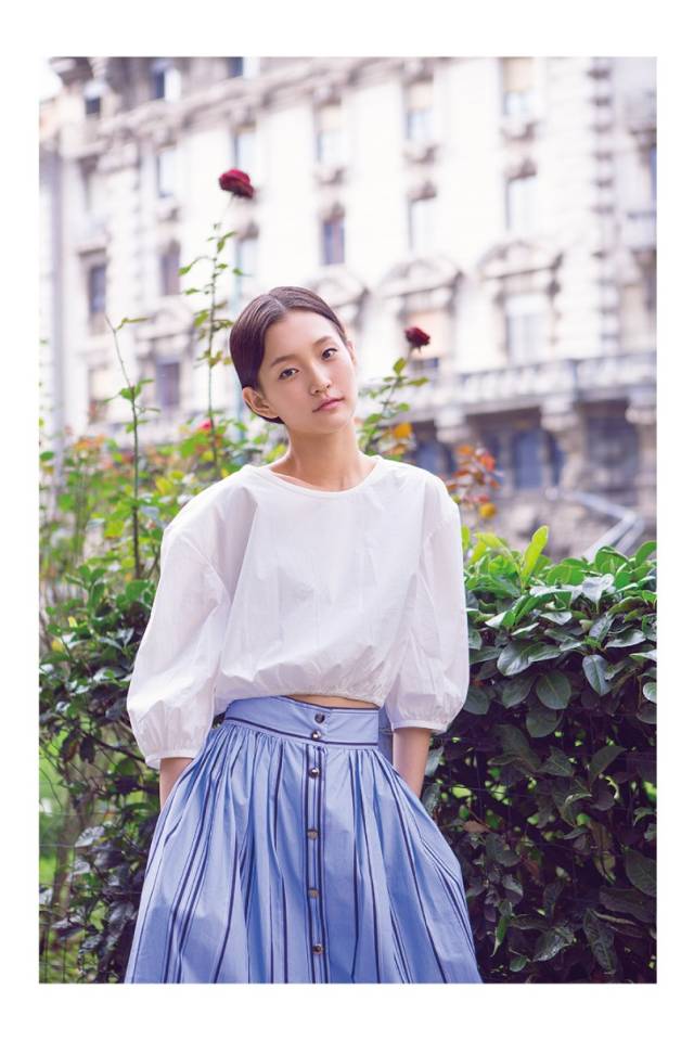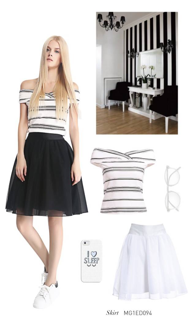 横条纹露肩修身上衣凸显优美锁骨和肩部线条,搭配蓬松欧根纱半裙,一面性感一面俏皮!