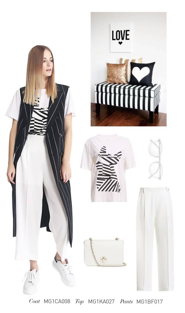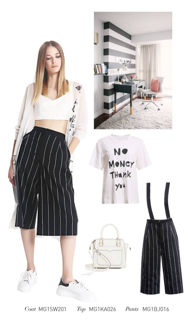 办公室女郎的LOOK是一道多选题!条纹组成的趣味汪星人T恤趣味十足,搭配白色九分阔腿裤略显随性,条纹西装马甲是点睛之笔,端庄气质信手拈来!
