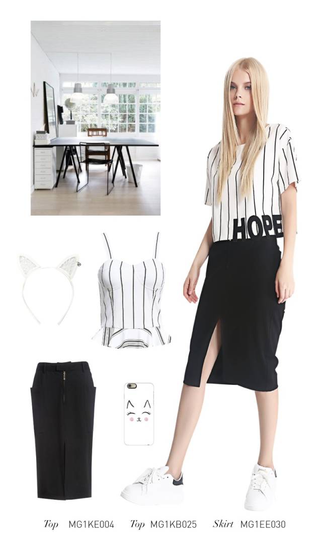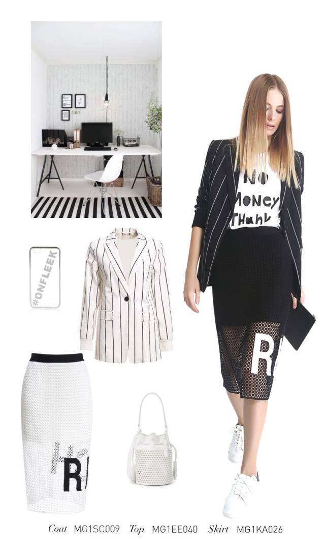 办公室女郎看过来,半透视及膝包臀裙不似一般半裙的死板乏味,全新面料和个性元素赋予你独特个性气质,内搭白色sloganT恤,在配上office lady必备的条纹西装,心机工作装让你端庄之余还能拥有时尚!