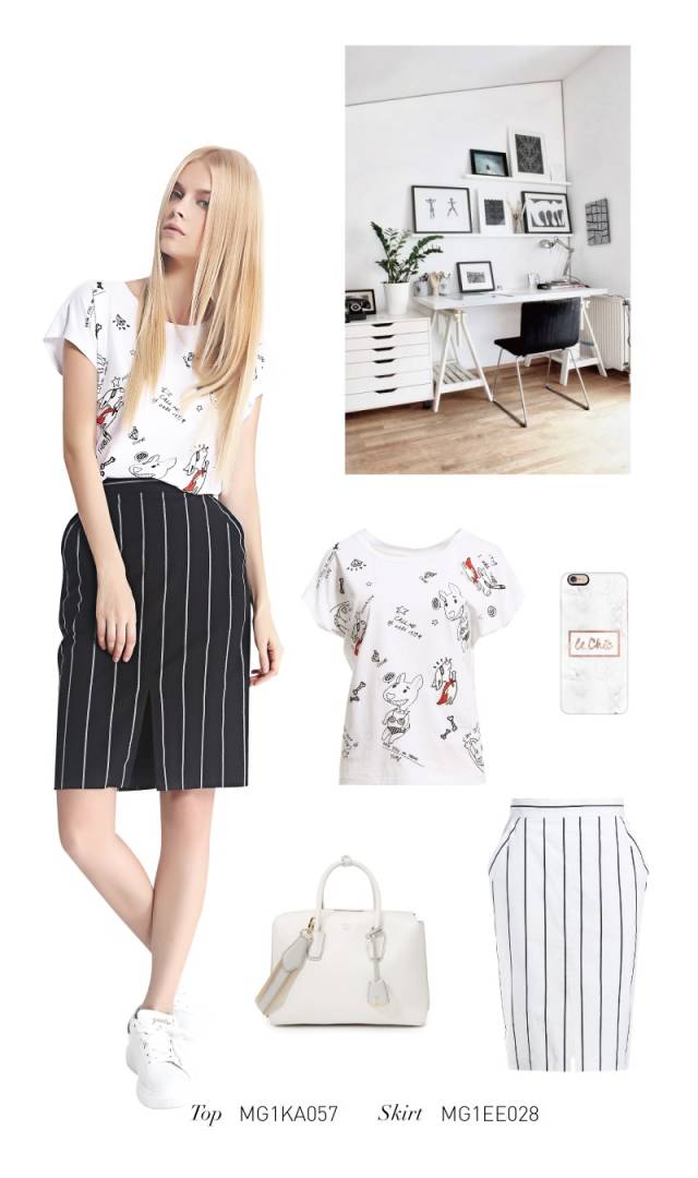 超有趣味的卡通T恤是你的必备减龄装备,搭配这款前开叉条纹半裙竟然会有一丝端庄气质!